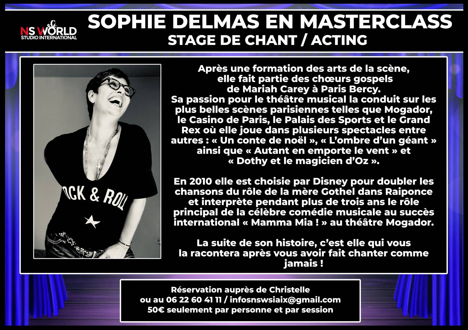 Pour les 13/17 ans retrouvez Sophie pour une superbe rencontre artistique. Découvrez ou re- découvrez cette incroyable artiste pour partager avec elle son histoire, ses anecdotes et profiter de tous ses conseils. Bien sûr, vous bénéficierez d'un cours de chant et d'acting magistral.