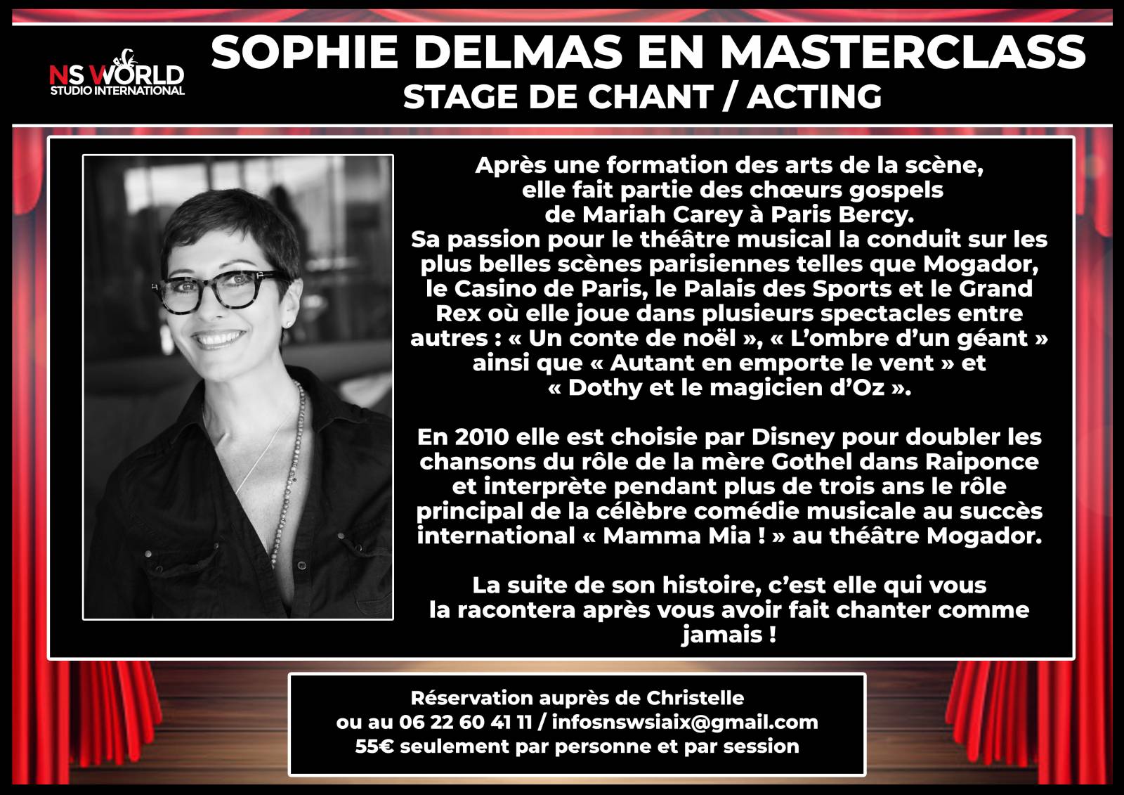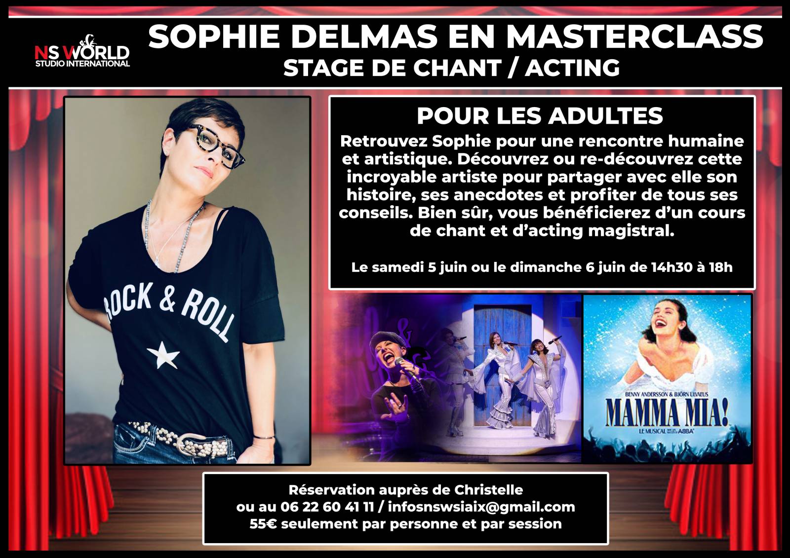 Retrouvez Sophie pour une rencontre humaine et artistique. Découvrez ou redécouvrez cette incroyable artiste pour partager avec elle son histoire, ses anecdotes et profiter de tous ces conseils. Bien sûr, vous bénéficierez d'un cours de chant et d'acting magistral.
