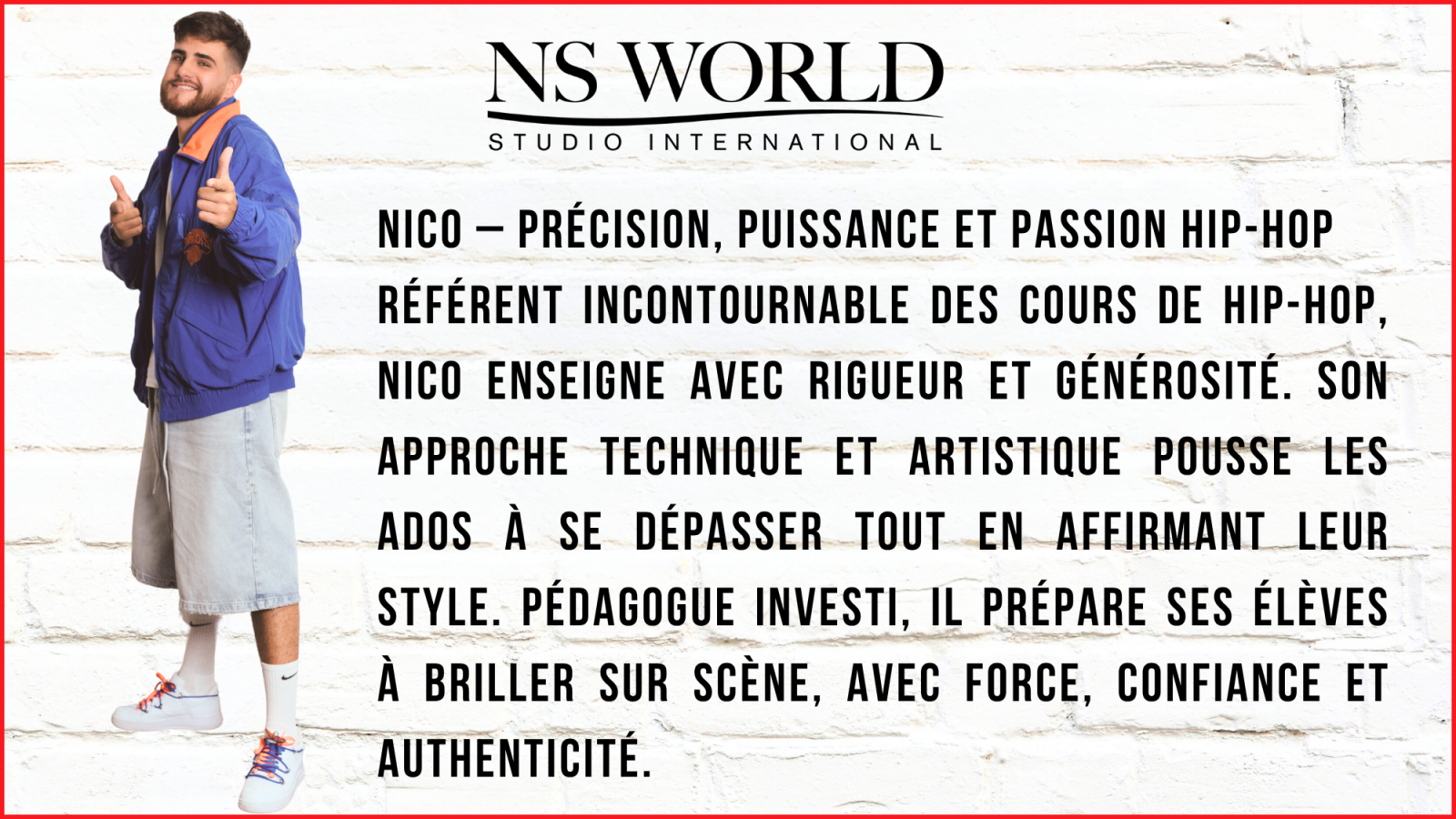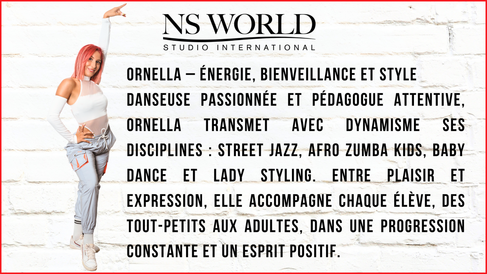 À la fois école artistique et lieu de vie, NS World Marseille est depuis plus de deux décennies une référence pour les passionnés de danse et de comédie musicale. Elle accueille chaque année enfants, ados et adultes dans une ambiance chaleureuse, bienveillante et dynamique, où chacun peut s’épanouir à son rythme.