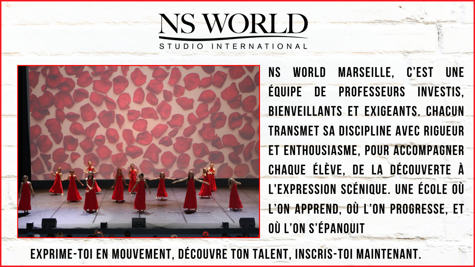 Chez NS World Marseille, la danse et la scène sont à la portée de tous. Venez vivre une expérience artistique complète, humaine et enrichissante, aux côtés de professeurs investis et dans une ambiance familiale.